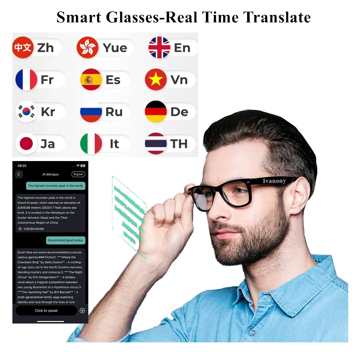 AI Smart Translate Eyeglasses Voice Assistant Music Play Receive Call Anti Blue Light Lenses 134+ Language Translate Sunglasses